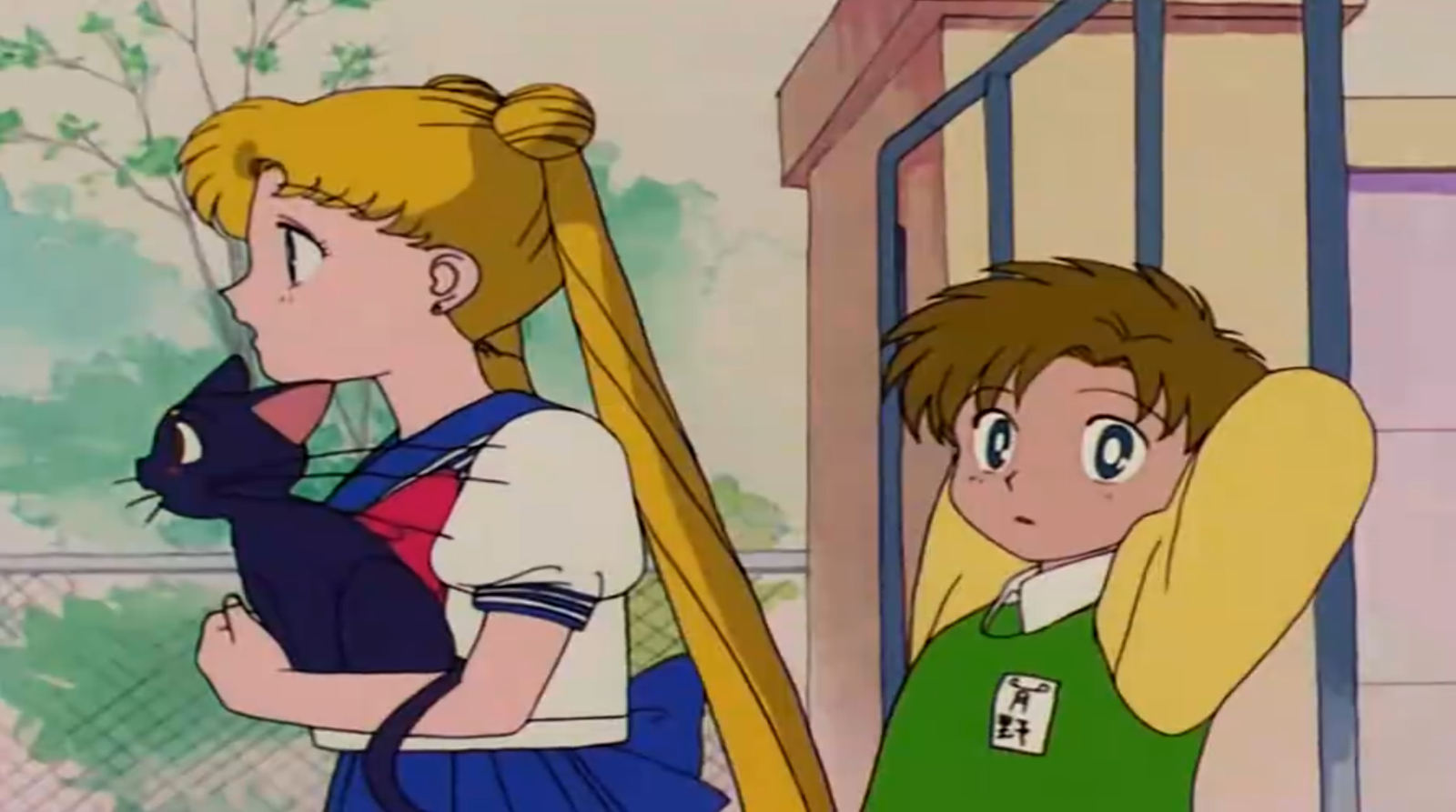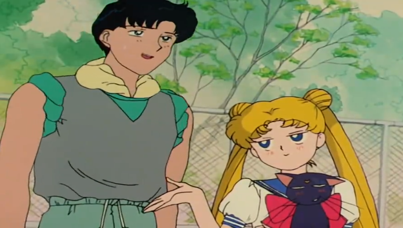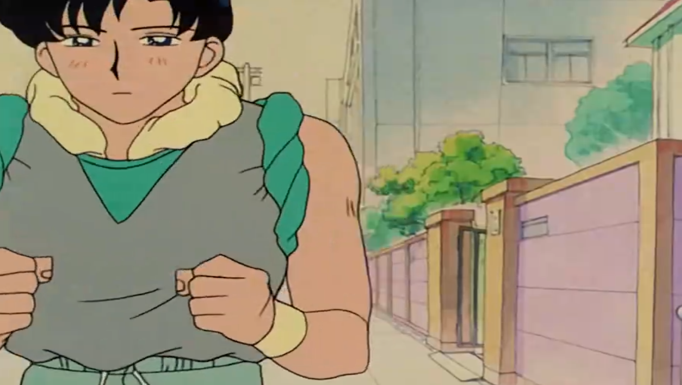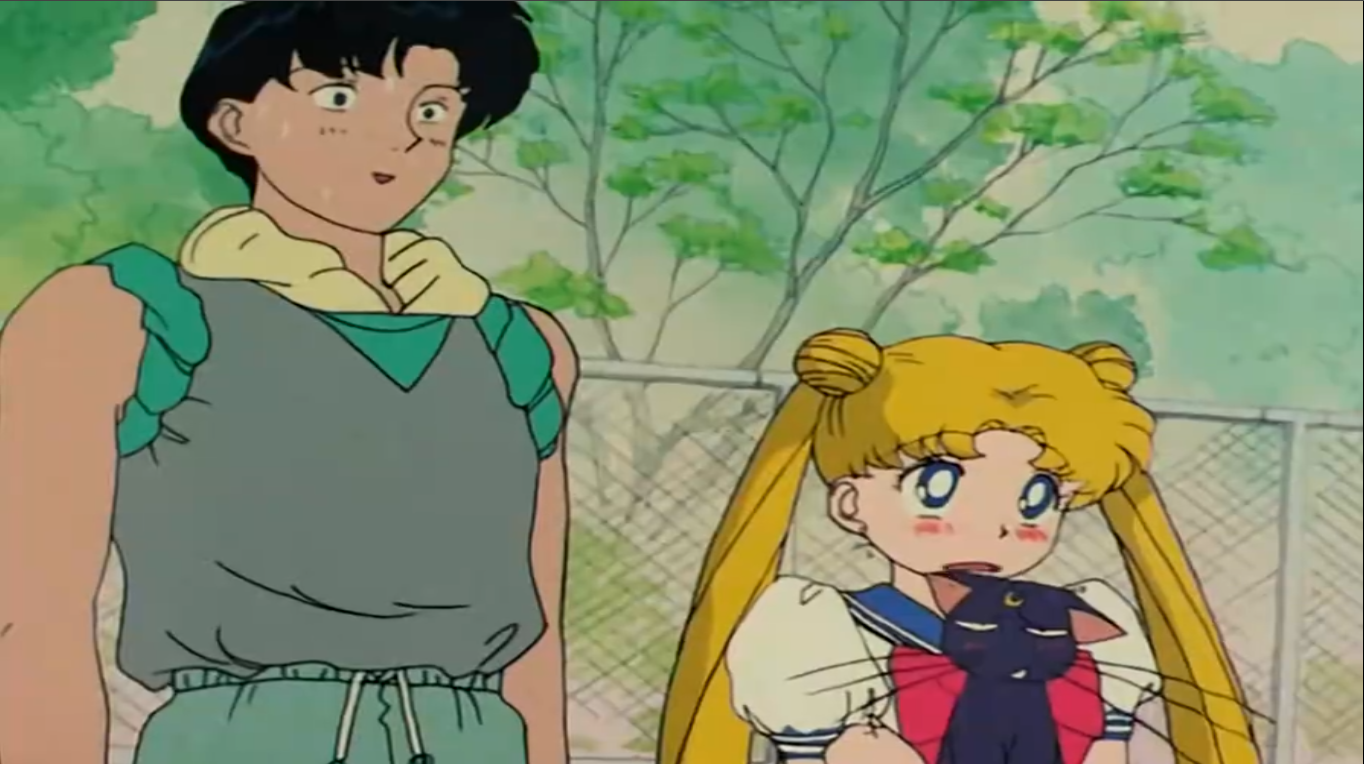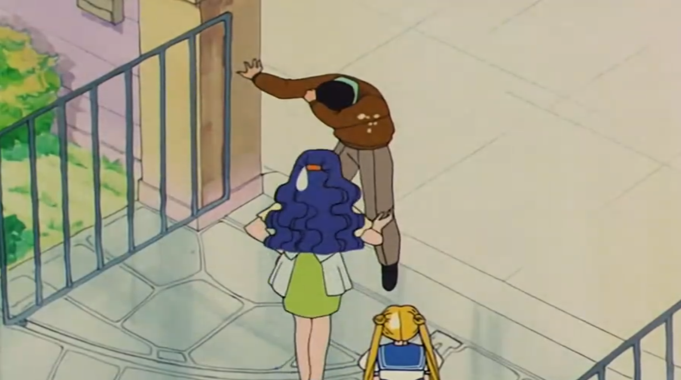 Chibi Usa has fled from home and Usagi's looking for her. Mamoru happens to be jogging around in his very interesting choice for sportswear and he's the one to call out her name when he sees her.