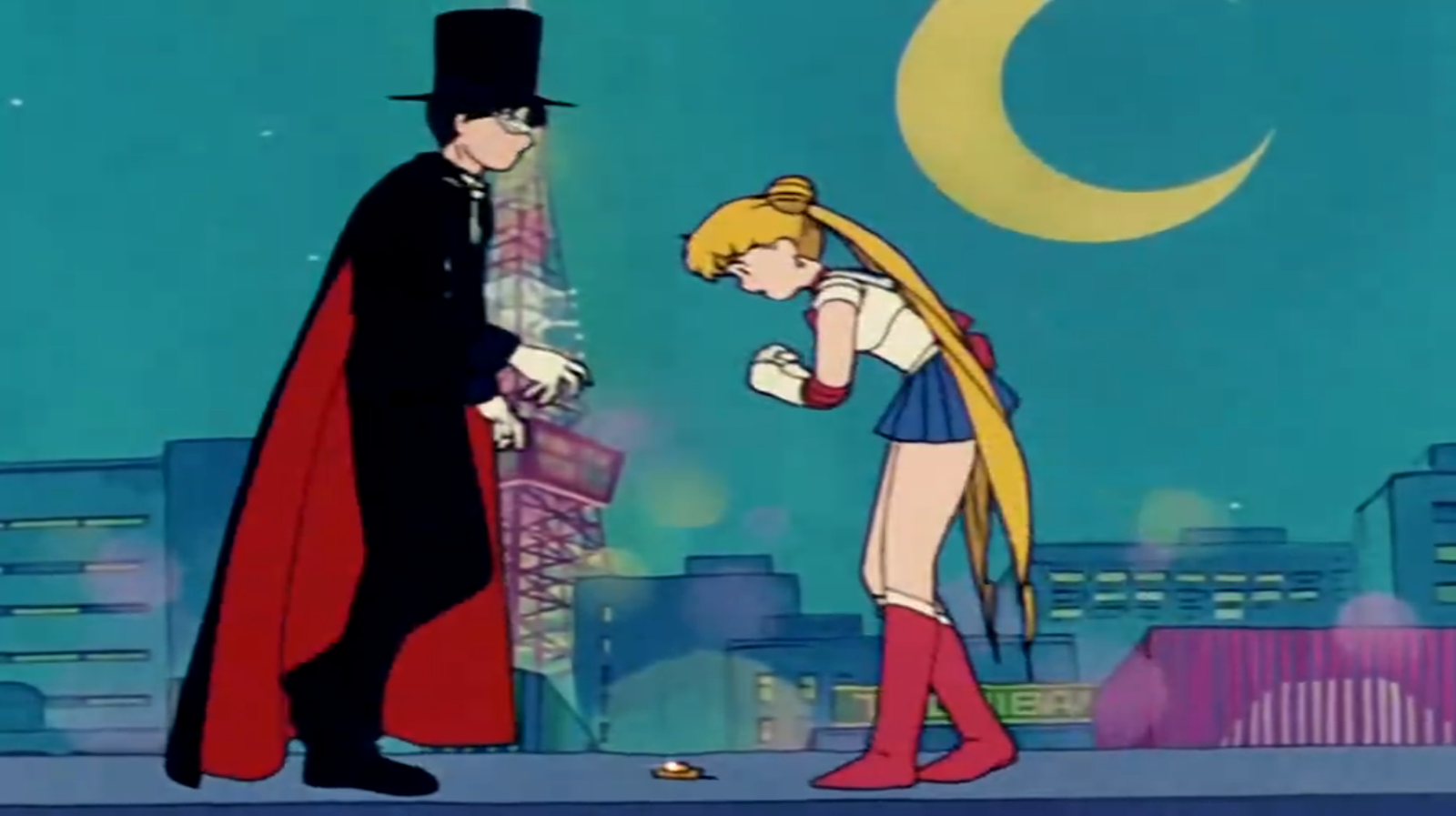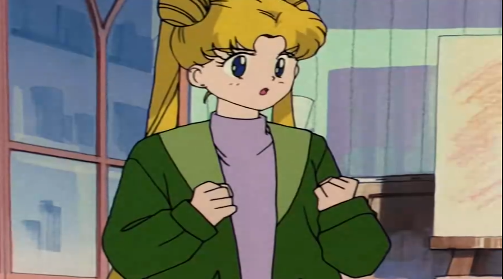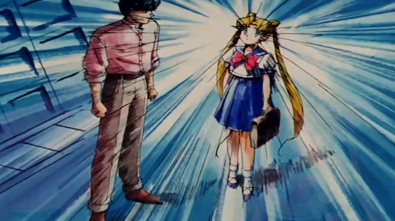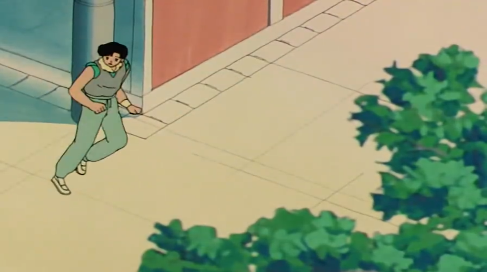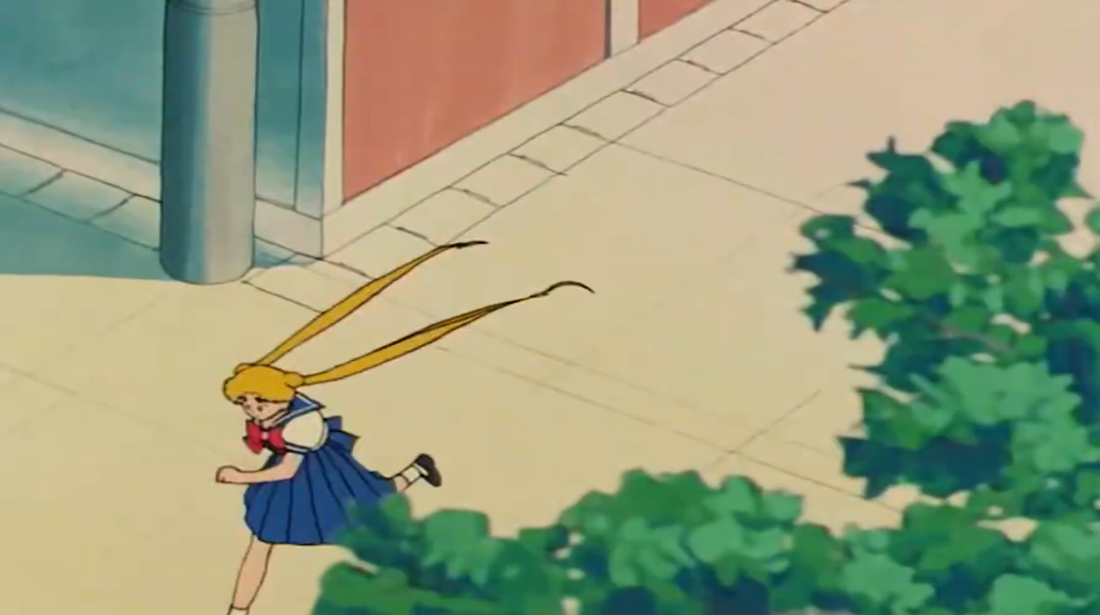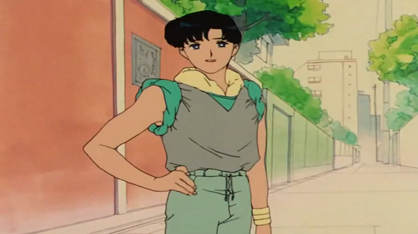 Chibi Usa has fled from home and Usagi's looking for her. Mamoru happens to be jogging around in his very interesting choice for sportswear and he's the one to call out her name when he sees her.
